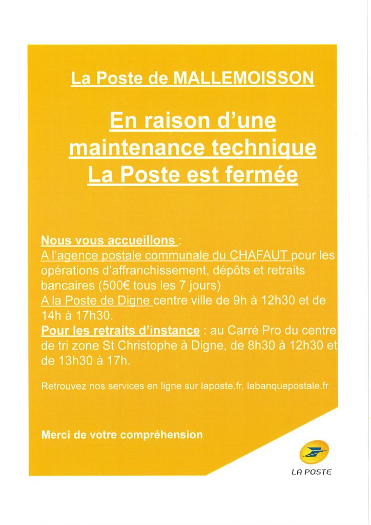 Fermeture du bureau de Poste de MALLEMOISSON ce mercredi 15 octobre pour…